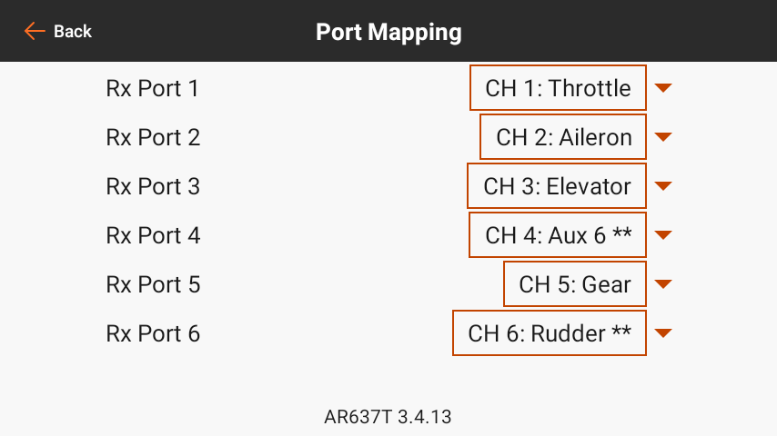 In this example, Rudder and Aux 6 remain on their original channels, but we are swapping the channel assignment of CH4 and CH 6 on the receiver side with port mapping. The outcome at the port outputs is the same as the previous example in terms of what function ends up on what receiver port. However, note there are no ** next to the channels as the functions are assigned to the default channels on the transmitter side.